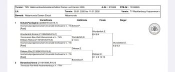 Das zugelassene Teilnehmerfeld mit 32 Herren und 15 Damen war ordentlich, bei den Damen hätten es gerne ein paar mehr sein dürfen, denn die Herren mussten einige Runden überstehen um unter die letzten 5 Teilnehmer zu kommen und Preisgeld mit nach Hause nehmen zu dürfen. So gab es 5. Plätze für Mathias Schediwy, Felix Wormsbächer, Paul Maximilian Eckert, Antonius Ueberschär bei den Herren und Dalia Lange, Daria Ammalainen, Angelina Lingner, Thalia Fischer bei den Damen jeweils ein Preisgeld i.H.v. 50 Euro bar auf die Hand. Die Verlierer der hochklassigen Halbfinalspiele gewannen 100 Euro. Diese waren die geteilten Drittplatzierten Charlotte Neumann, Collien Kriegel, sowie Mick Rupprath und Yannick Leon Scherer. Das Finale der Damen entschied Jolien Ueberschär klar für sich und verwies mit Platz 1 und 200 Euro Preisgeld, die Zweitplatzierte Tabea Sophie Saubert mit 150 Euro in die Schranken. Spannender und hochdramatisch ging es im Herrenfinale zu. Vorjahresfinalist Tom Korpatsch gewann gegen Levien Giermann am Ende 4:6 6:4 10:4 und bewahrte im richtigen Moment kühlen Kopf. Die Turnierleitung mit Nicole Jerichow und Oberschiedsrichter Torsten Kloß freuten sich auch diesen beiden Pokale, Urkunde, sowie Preisgeld (200 und 150 für Zweitplatzierten) überreichen zu dürfen. Die Preisgelder sind von den Teilnehmern selbst zu versteuern.