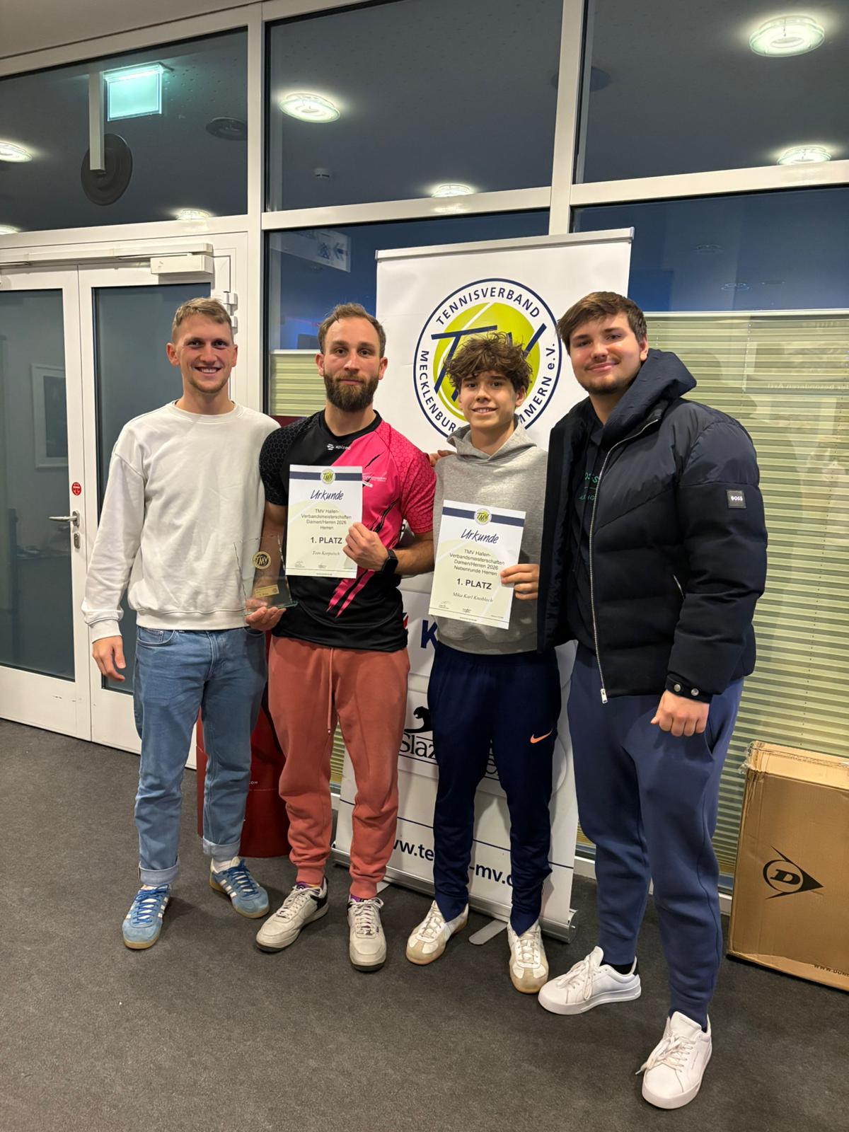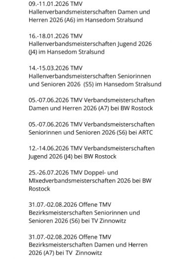Die TMV Hallenverbandsmeisterschaften der Damen und Herren 2026 kehrten nach 1 Jahr Abstinenz (Wonnemar Schwerin) wieder zum Hansedom Stralsund zurück. Im Endeffekt müssen Hallenbetreiber und Turnierveranstalter wirtschaftlich denken, so wählte man dieses Jahr wieder den Hansedom auch wenn man keinen fixen Hallenbetrag hatte. Um möglichst viele Stralsunder war man bemüht, am Ende waren es Eva-Lotta Metz, Hilde Linke, Lennart Steinbach, Tom Litzkow, Andre Litzkow, Björn Bork. Die Vorgabe von 10 Stralsundern pro Turnier konnte nicht ganz erreicht werden. Turnierveranstalter Torsten Kloß musste obwohl Lokalmatadoren Priorität haben auch Spieler schützen, die noch nicht lange Tennis schützen und konnte nach klärenden Gesprächen auch aufgrund des anstehenden Jugendturniers nächste Woche nicht jedem eine Wildcard vergeben. Die Chance als Nachrücker ins Hauptfeld nachzurücken bestand für die 5 Nachrücker bei den insgesamt 37 gemeldeten Spielern.